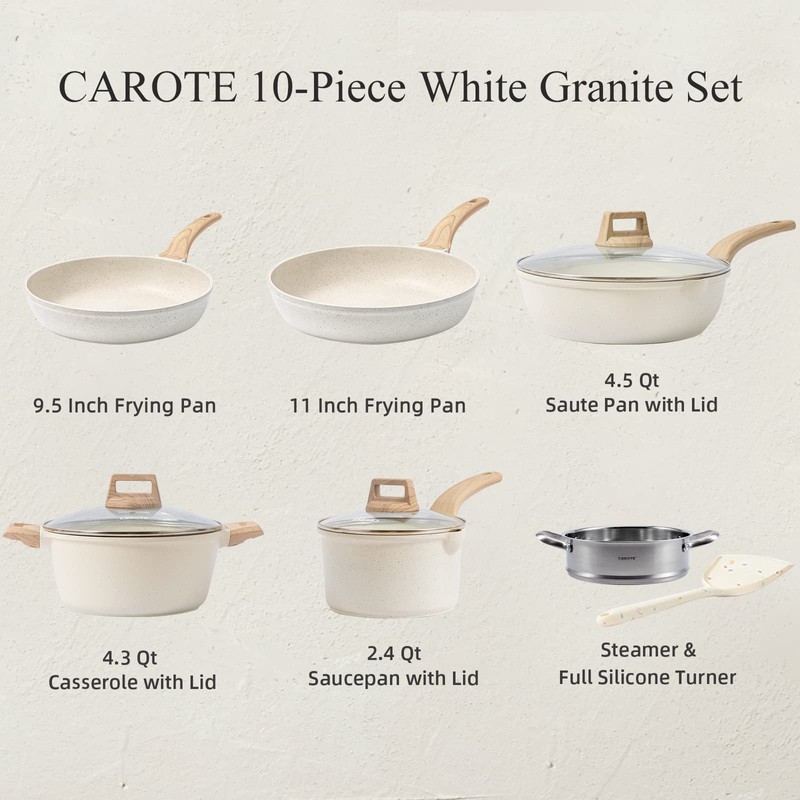 - CAROTE 10-Piece Cookware Set Includes :9.5 inch Frying Pan, 11 inch Frying Pan, 2.4 QT Saucepan with Lid and steamer, 4.3QT Casserole Pot with Lid, 4.5QT Saute Pan with Lid, White Silicone Turner. Our favorite non-stick pots and pans set meets all your need for every day cooking