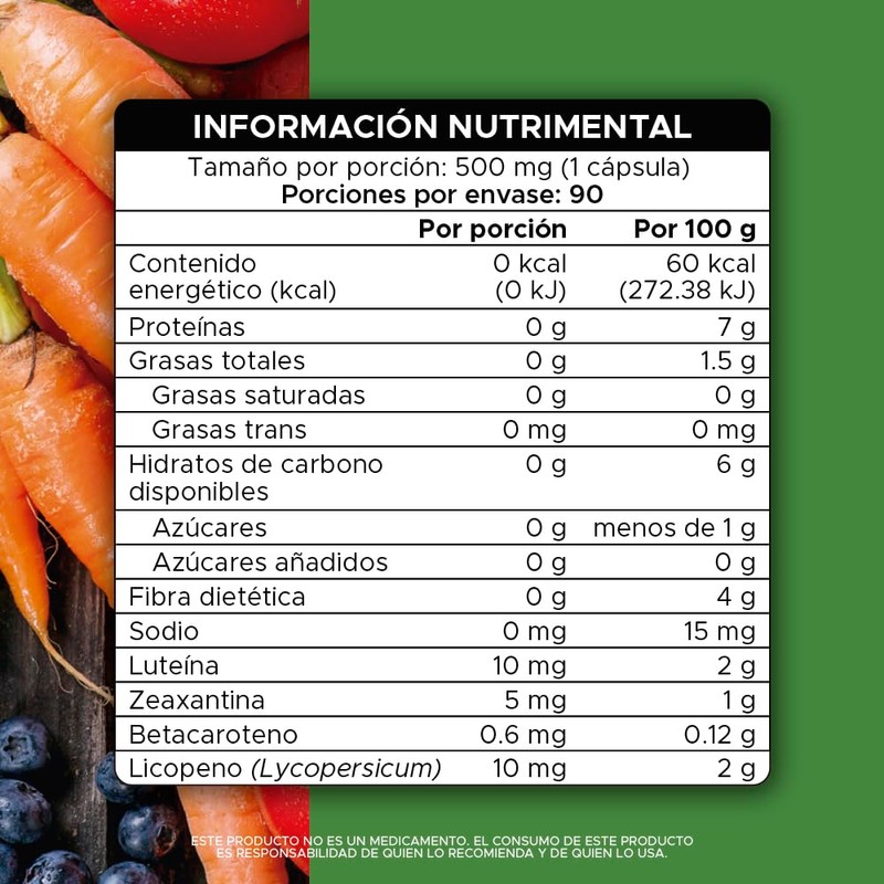 - Fórmula con carotenoides naturales: Mezcla concentrada de licopeno, luteína, zeaxantina y betacaroteno, obtenidos de frutas y vegetales como tomate, zanahoria y arándano. Ingredientes de origen vegetal: Elaborado con extractos naturales de alto perfil nutricional, sin conservadores ni colorantes artificiales. Formato en cápsulas prácticas: 90 cápsulas de 500 mg cada una, fáciles de integrar en la rutina diaria. Sin declaraciones terapéuticas: Este producto está formulado sin promesas de beneficios médicos, conforme a regulaciones vigentes. Calidad PACALLI: Suplemento fabricado bajo estándares estrictos de calidad e integridad de ingredientes.