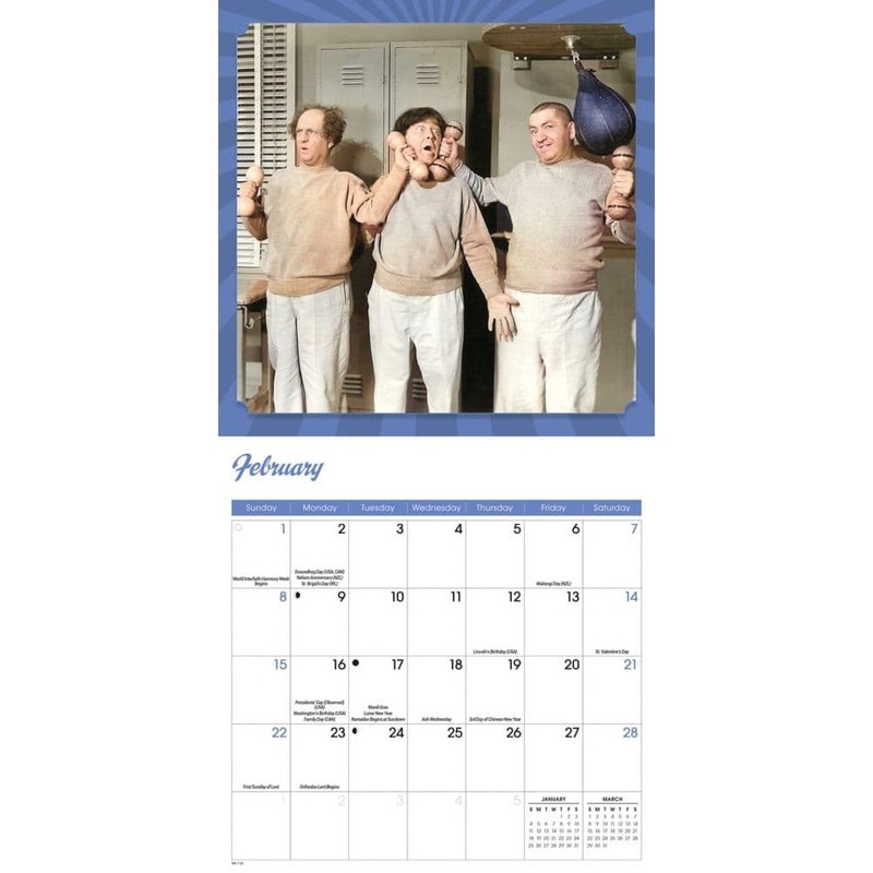 • - Three Stooges theme ? monthly classic Moe, Larry, and Curly imagery and quotes for comedy fans. - Mini-wall format ? compact monthly layout with medium grid size for easy appointment tracking. - Ideal size ? measures 7" x 7" closed for convenient display in small spaces or on walls. - Stapled binding ? high-quality, glossy paper with secure binding for durability throughout the year. - Full coverage ? 16 Month calendar starting 8/31/2025 with major U.S. holidays and notable TV dates