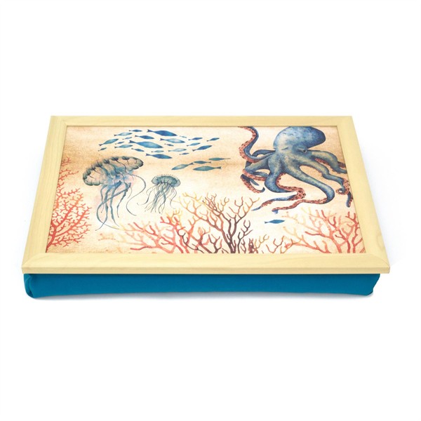 OCTOPUS LAP TRAY | Bring a coastal vibe to any setting with our cushioned lap tray. It features a mesmerising octopus design, complemented by delicate coral, all set against a cream backdrop. This lap tray is both practical and visually appealing, making it ideal for adding a touch of nautical charm to your home