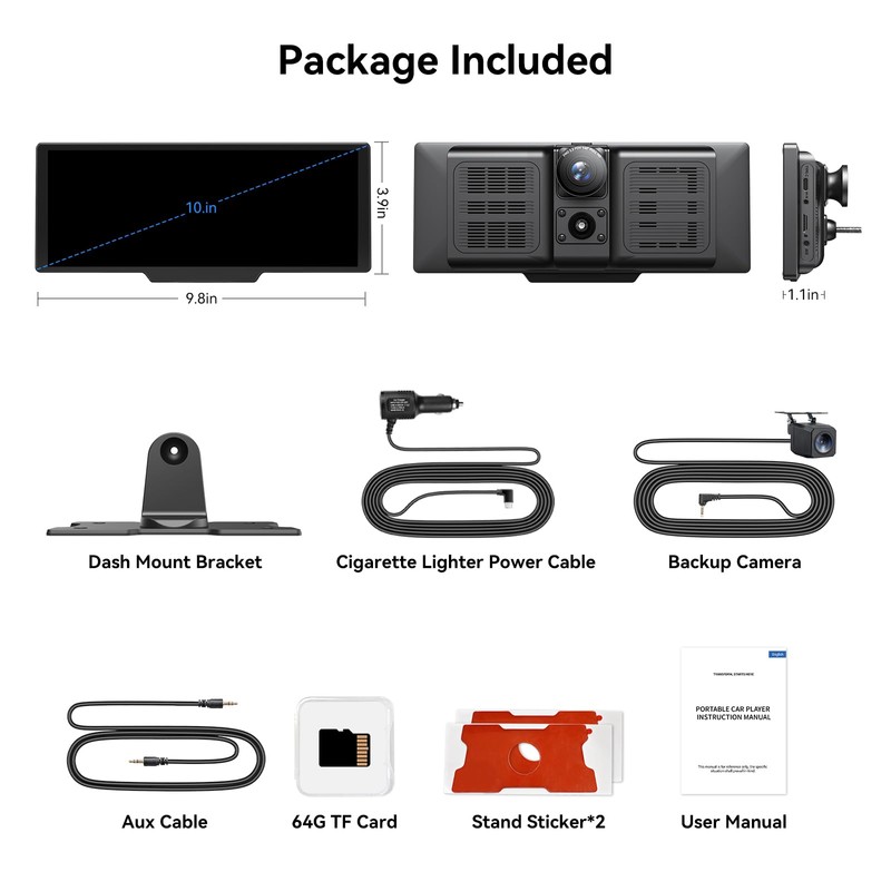 • 【4K Front + 1080P Rear Dual Cam Loop Recording】: Our portable car play screen features dual-channel recording with a 4K front camera and 1080P rear backup cam, capturing crisp footage of road conditions and surroundings. This carplay screen supports loop recording, video playback on smartphones, and includes a 64GB TF card for storage. Enhanced safety with split-screen views while reversing.