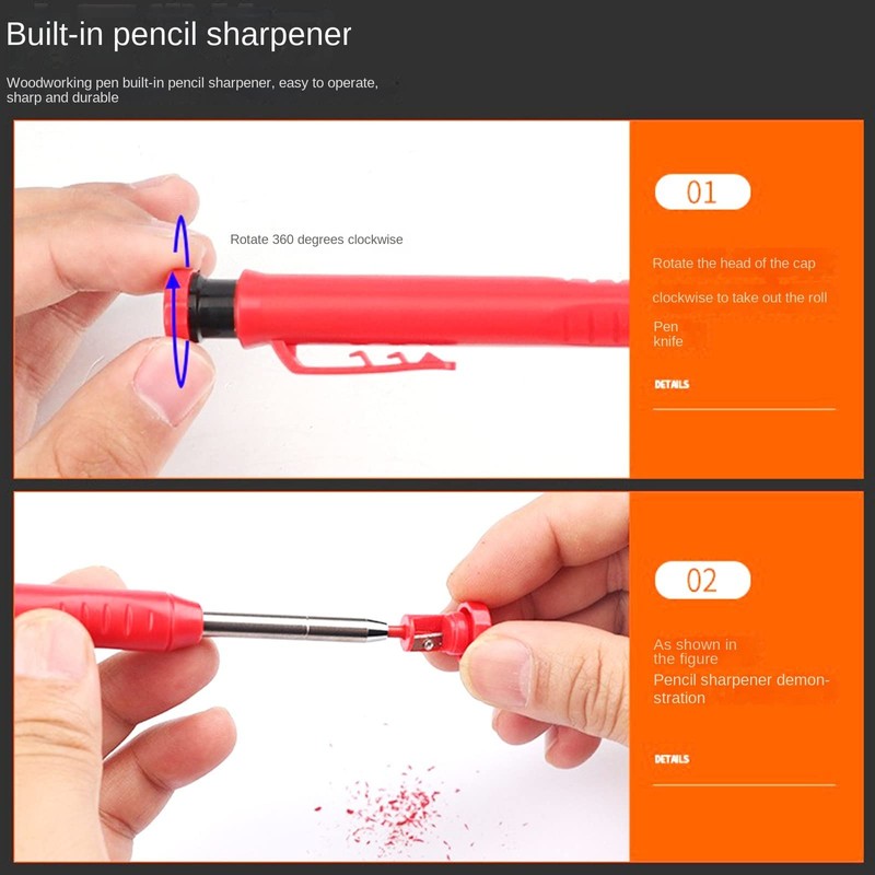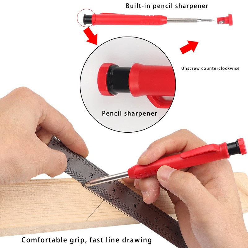 "This solid carpenter penci, made of high quality materials, can be widely used for construction carpentry scribing, draughtsman drawing, long and thin nib, can mark narrow and deep places, suitable for a variety of materials, is an essential carpenter tool