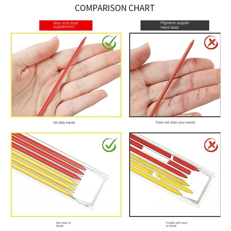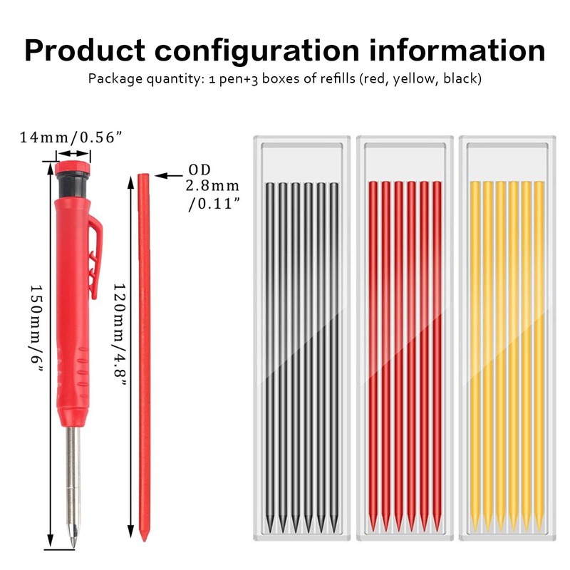 • 【Set List】Solid carpenter pencil set includes a woodworking pencil, 3 boxes with 18 refills (red, yellow and black), to meet the marking of different color materials