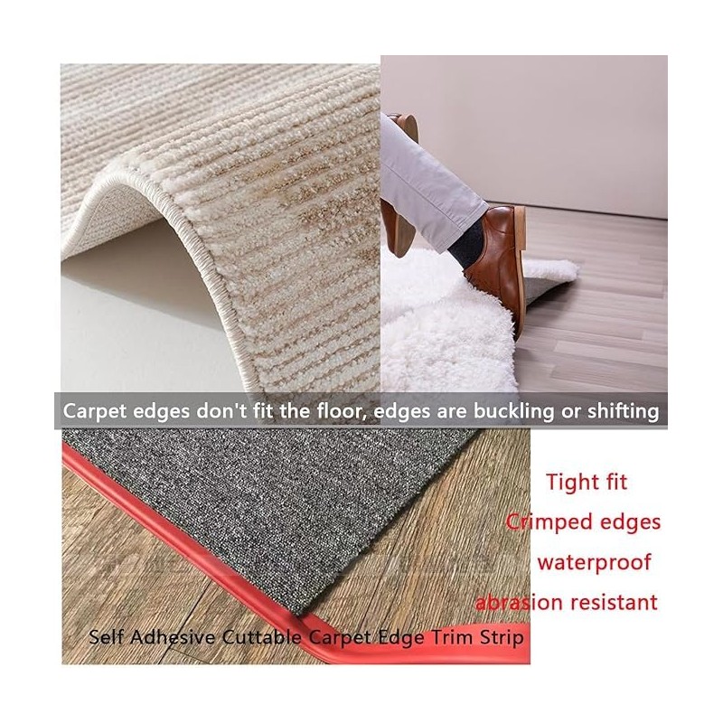 - Carpet Edge Trim: This self-adhesive strip features industry-leading adhesive for long-lasting stability, preventing peeling edges. Clean the surface before installation, and apply heat with a hair dryer if bent during shipping for better adhesion
