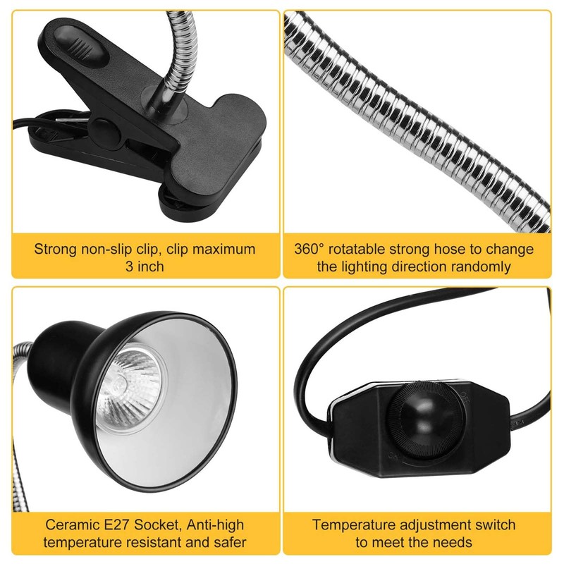 - 💡 E27 Standard Head: Compatible with a variety of E27 bulbs, including fluorescent, incandescent, LED, halogen, and UV lamps, this heat lamp is versatile for all your reptile heating needs.