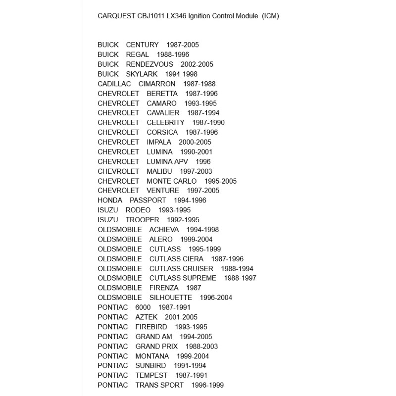 Elevate the performance of your vehicle with the CARQUEST PREMIUM VEHICLE SOLUTIONS CBJ1011 Ignition Control Module. Specifically engineered for compatibility with a range of models including IMPALA, GRAND PRIX, MONTE CARLO, and CENTURY with 3.4 and 3.1 V6  engines, this component is designed to meet the stringent specifications of your car's ignition system. The module, with part number CBJ1011, ensures a seamless fit and reliable function, backed by the quality and expertise of CARQUEST. The SKU YMP:CBJ1011 represents a single unit, ready to provide the necessary solution for your vehicle's ignition control needs. Keep your engine running smoothly with this essential automotive component.
