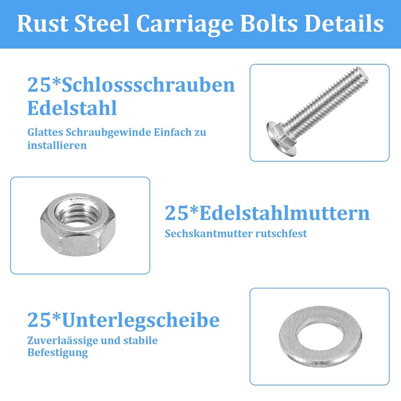 - Highly corrosion-resistant stainless steel: carriage screws M6 are made of A2 V2A stainless steel with smooth, burr-free surface, high strength and deformation freedom. Long-term rust protection is suitable for various indoor and outdoor applications.