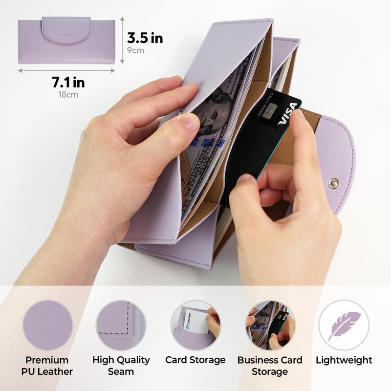 carrotez All-in-One Long Bifold 2-Tier PU Leather Wallet for Women, Money Organizer for Travel, Budgeting, Cash Envelope Wallet for Carrying Cash, Credit Cards & Business Cards - Lavender