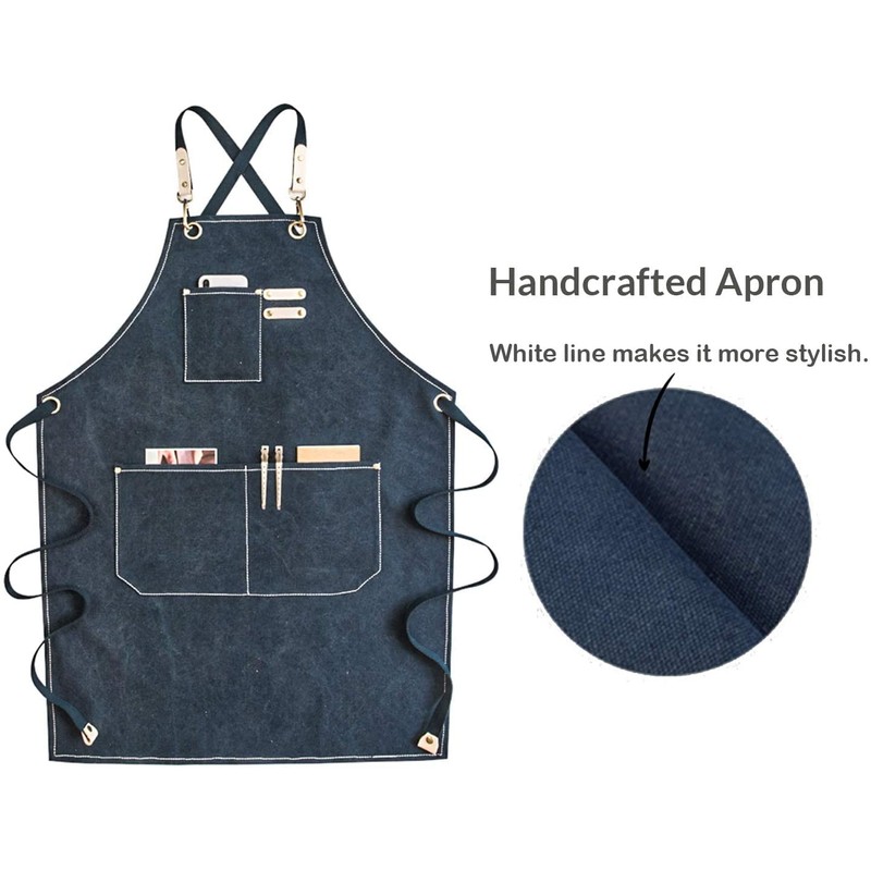 - Double stitched pockets for high functionality and durability with 3 multipurpose pockets in the front. Practical to put in your cell phone, recipe cards, pens, notebook, grill slips, meat thermometer and other items you need. Convenient for gadget storage. Work apron, shop apron.