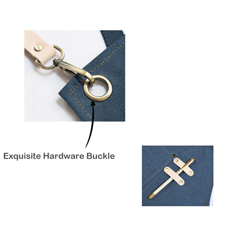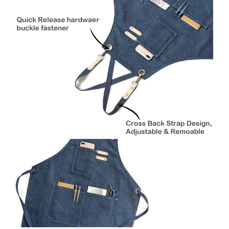 - Adjustable Cross Back & Quick Removable Straps prevent neck pain. Bib apron measures 23 inches wide x 31 inches tall for full coverage and unisex sizing. Extra long straps with quick release buckle accommodates wide range of sizing up to men's XXL sizes (59 inch waist). Adjustable length with cotton tie straps for comfortable wear. Quick release brass buckle fastener is removable and allows for flexible wear.