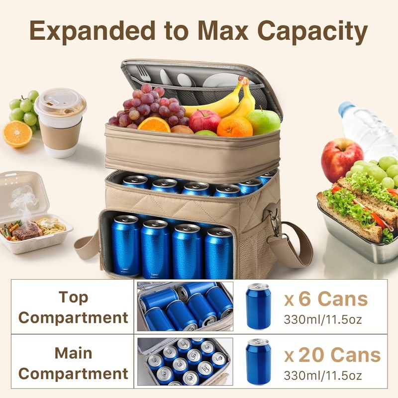 - Large Capacity & Expandable Design:Our double-layer puffer lunch bag features a spacious lower compartment (10*7*7.5 inches) that holds up to 6 bottles of 500ml drinks, while the expandable top compartment (10*7*2.5 inches) offers extra space for lunch boxes, fruits, or snacks. With a reinforced metal zipper for easy expansion and a total capacity of up to 16L, this bag is perfect for work or travel.