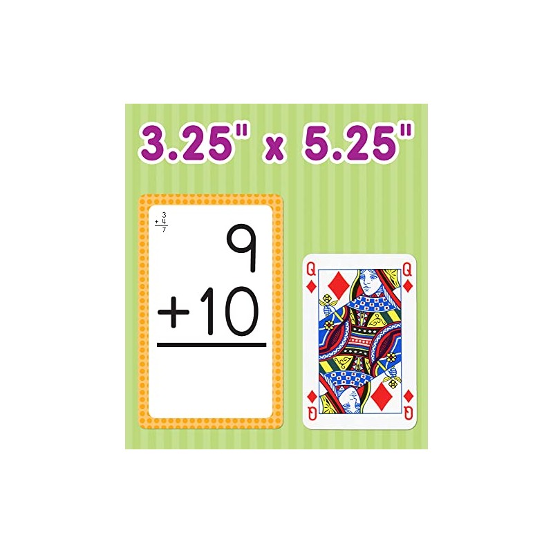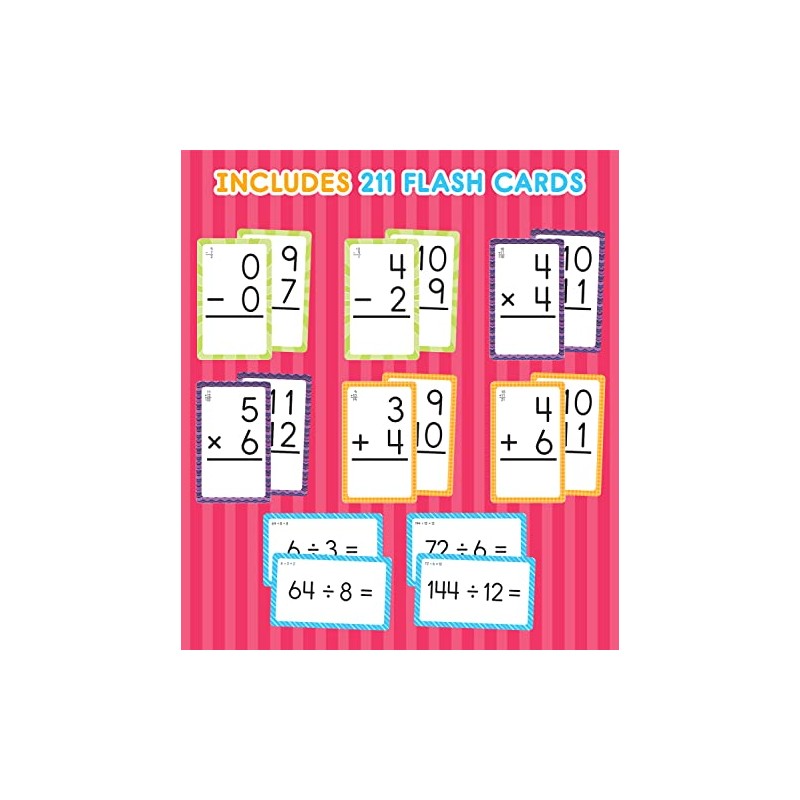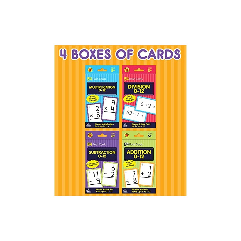 FLASH CARD SET FEATURES:? Ages 6+, All Grade Levels? 216 cards total, 5.25 inches x 3.25 inches? Covers addition, subtraction, multiplication, and division? Double-sided with self-check helpful hints on each card? Includes resource cards for fun learning games and activitiesFOCUSED PRACTICE: Carson Dellosa's Math Flash Card Set helps kids ages 6 and up to enhance their math readiness skills with interactive flash cards covering addition, division, subtraction, and multiplication. Students engage in fun, educational activities while building confidence and developing important mathematical skills for future learning.WHAT'S INCLUDED: This activity-packed set includes 4 sets of flashcards to practice addition, subtraction, multiplication, and division skills. Each set also comes with a bonus card that includes additional learning games and fun-filled activities.HOW IT WORKS: Students will use the double-sided cards to practice their addition, subtraction, multiplication, and division skills with numbers 0-12. Kids can use the self-check helpers in the top left corner of each card. Students, parents and teachers can check the answers on the back of each card for accuracy.WORKING TOGETHER: A great teaching tool for both parents and teachers, these flash cards provide an easy way to review early math skills at home, in a small group setting, the classroom, or on the go. Use the resource cards to engage students in fun learning games and activities incorporating each set of flash cards.WHY CARSON DELLOSA: For more than 40 years, Carson Dellosa has provided solutions for parents who want to help their children get ahead and for teachers who want their students to meet and exceed set learning goals. Carson Dellosa partners with you in supporting your child's educational journey every step of the way.