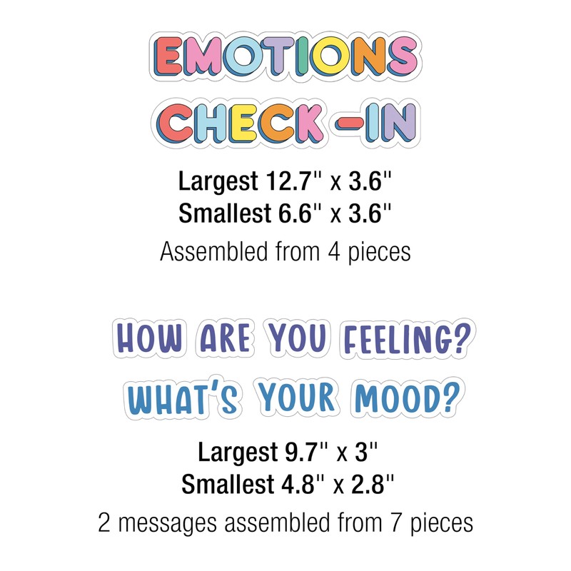 • What’s Included: The SEL bulletin board decorations includes a 4-piece Emotions Check-In header, 2 positive sayings, 5 calming corner signs, and 30 student pieces.