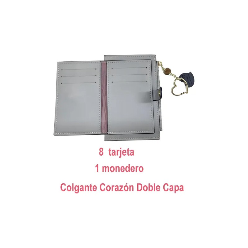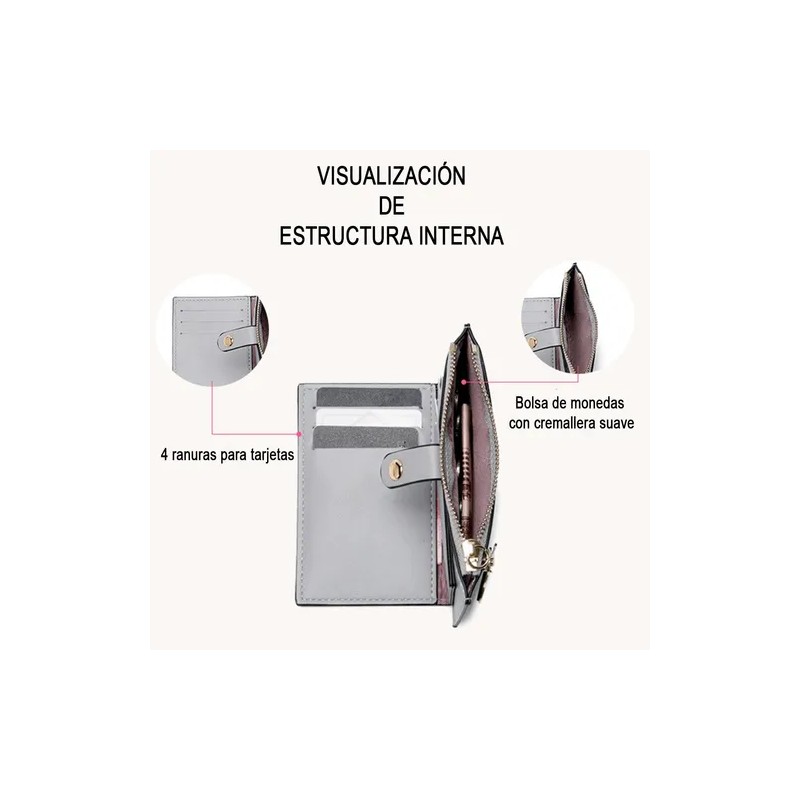 Capacidad: ocho ranuras para tarjetas en el interior, un monedero con cremallera en el lateral para monedas y billetes
