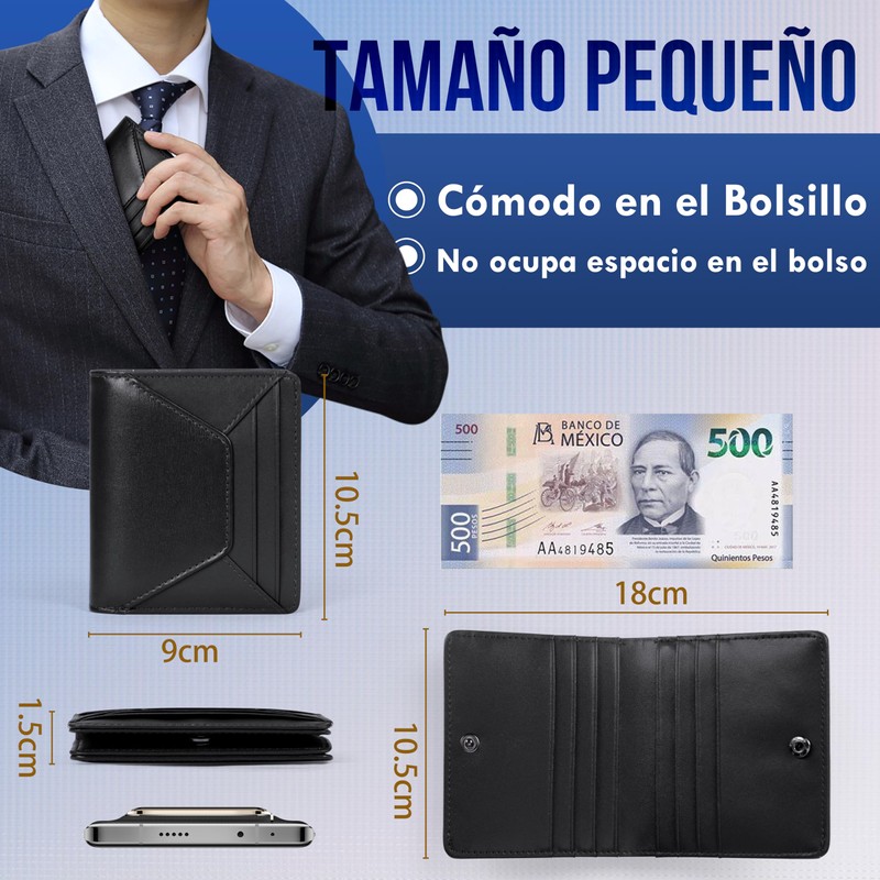 - Esta Carteras para caballero mide 10.5 x 9 x 1.5 cm y tiene capacidad para unos 20 billetes y 10 tarjetas. Tanto si llevas una cantidad pequeña como grande de dinero en efectivo, esta billetera se adapta perfectamente a tus necesidades. Es ligera y delgada, por lo que es fácil de guardar en el bolsillo del abrigo o del pantalón. Además, el cierre de botón garantiza que se mantenga compacta y no abulte.