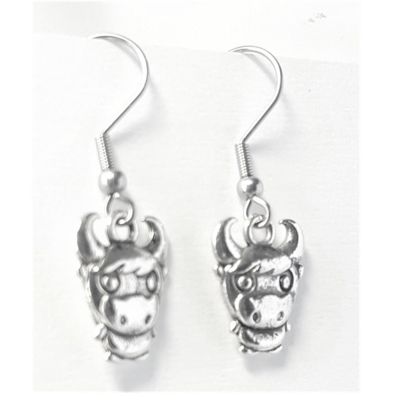 Cartoon Bull with Big Head - 15x12mm - Silver alloy charm dangle earrings. Hypoallergenic Stainless-Steel Fishhooks or Ball-Post or Silver Plated Ball-Post Earrings Optional