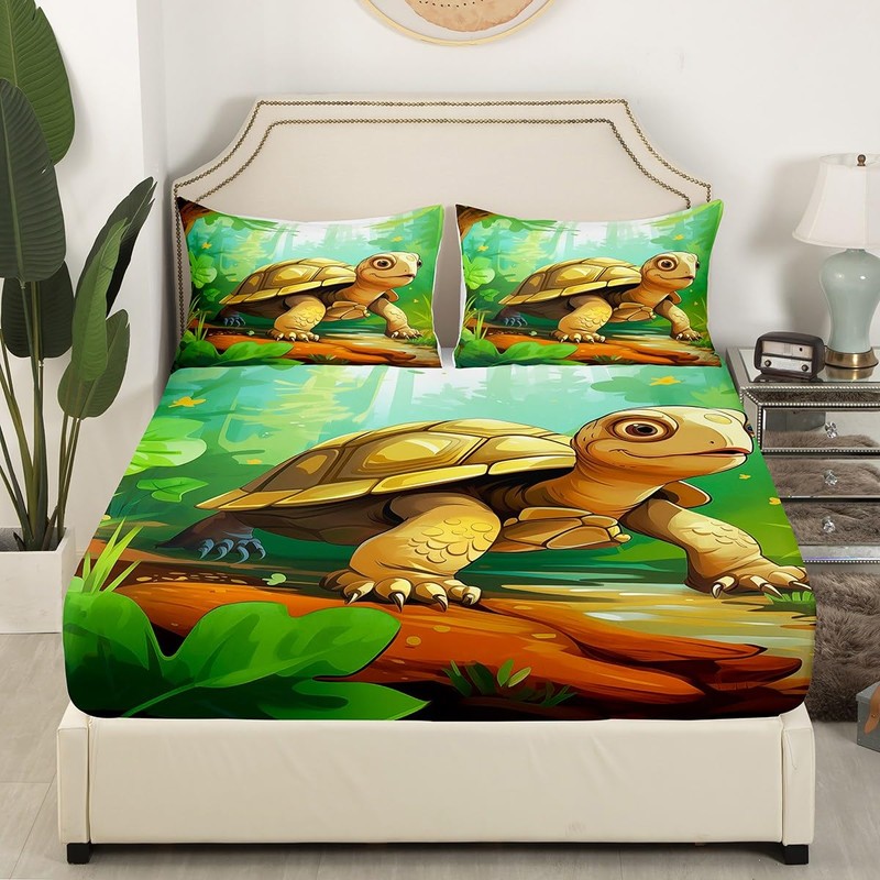 Cartoon Tortoise Kids Fitted Sheet Full Size,Jungle Botanical Plants Bedding Set,Boys Men Room Decor,Turtle Wild Reptile American Animals Rustic Bed Cover,Green Bed Sheet,2 Pillowcases