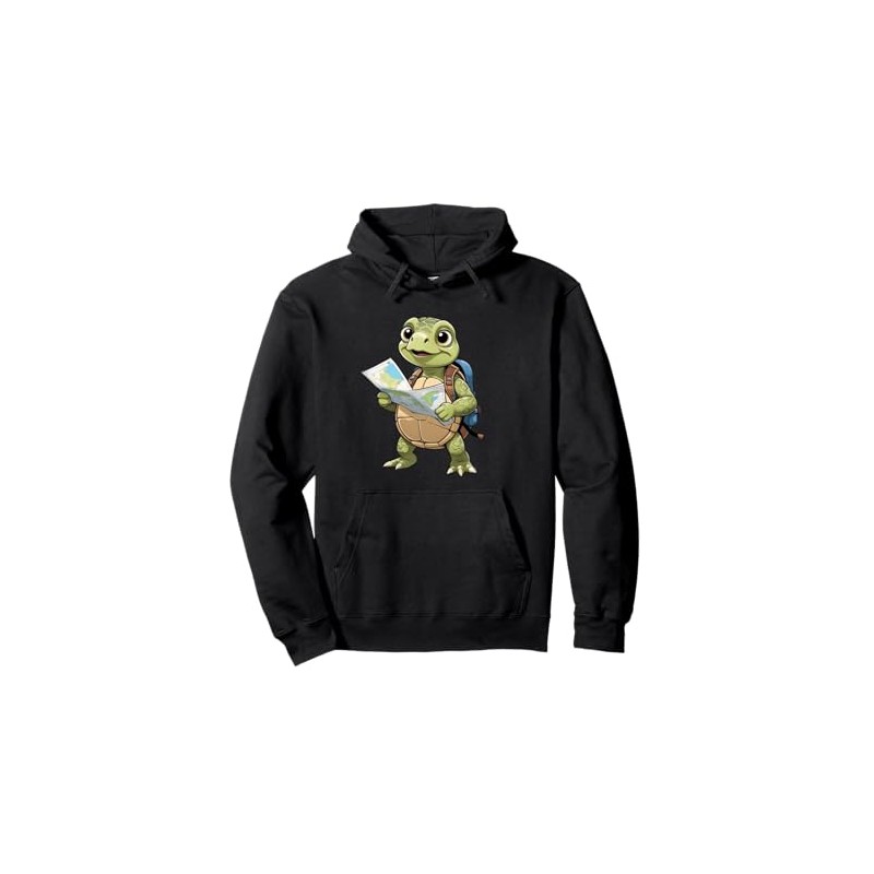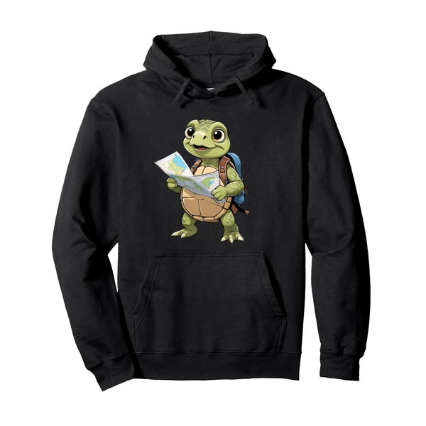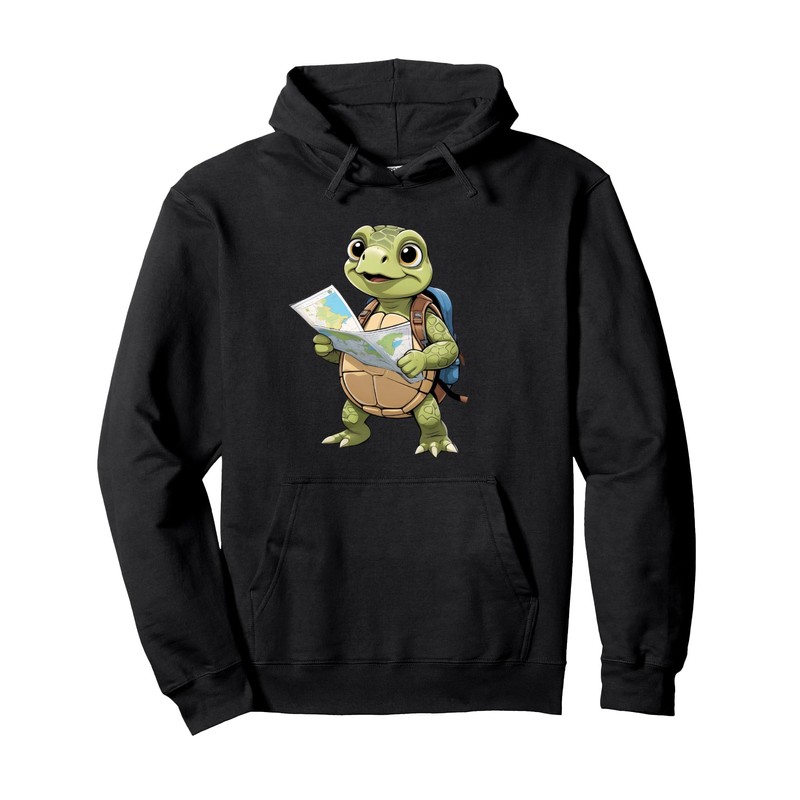 Cartoon Turtle Traveling With Map And Backpack Illustration Pullover Hoodie