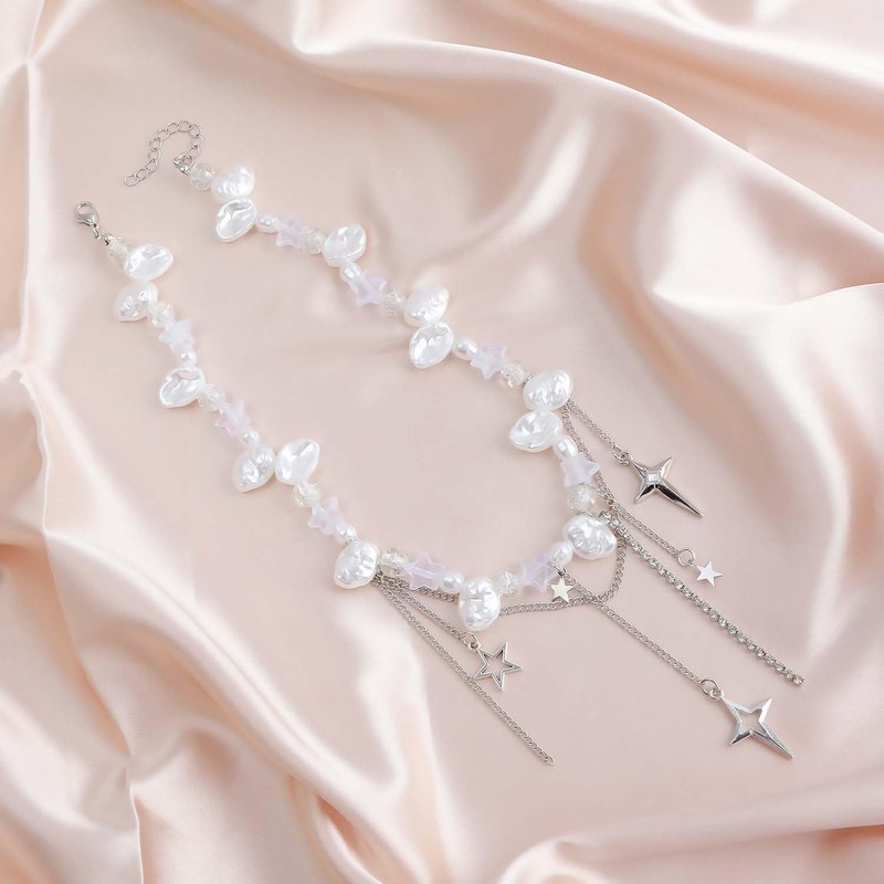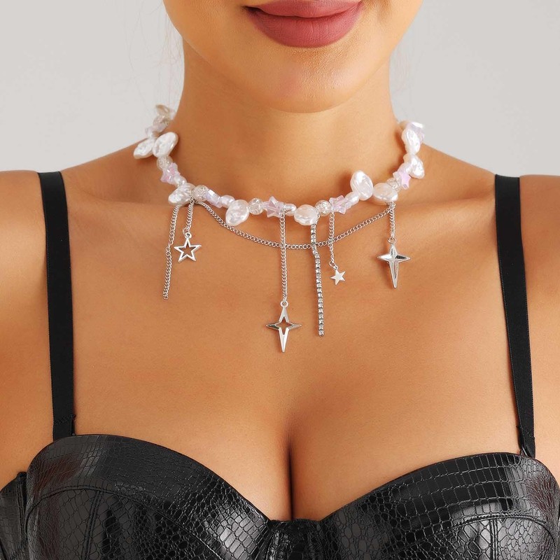 Carufin Halskette mit Kristall-Anhänger, Perlenkette mit funkelnden Stern-Anhängern, geschichtete Schlüsselbeinkette, Schmuck für Damen, Einheitsgröße, Metall Kunstperlen Metall, Kein Edelstein