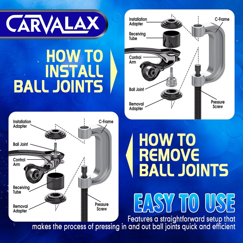 - COMPREHENSIVE 23-PIECE SET: CARVALAX versatile ball joint press kit includes all essential components, installation adapters, sockets, tubes, cups, a heavy-duty 9” C-frame press (HRC32-38) with a 6” opening, and an extra tough pressure screw (HRC28-36), ensuring the right tool is available for any ball joint removal or installation task.