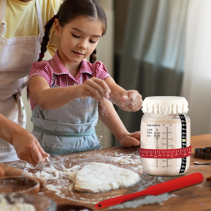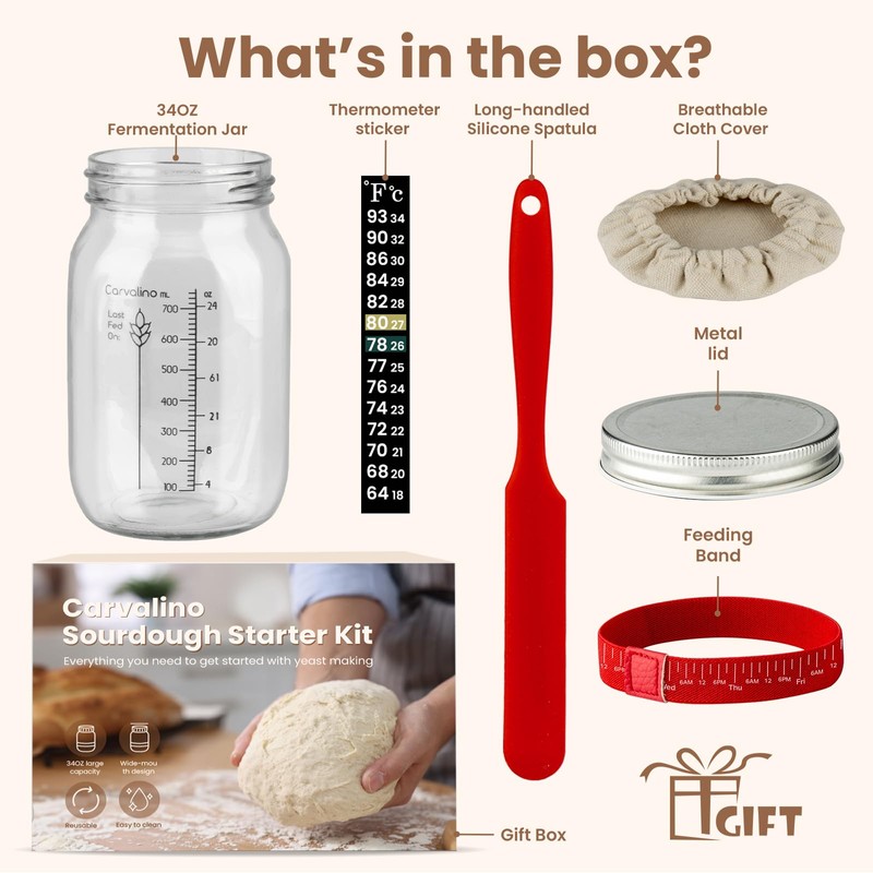 - 【The Perfect Sourdough Bread Starter Kit】- Our sourdough kit has got you covered with a wide-mouth sourdough jar, a temperature sticker, a feeding track band, a long-handled silicone spatula, a breathable cloth cover, a metal lid, and a beginner-friendly sourdough recipes! The Carvalino fermentation kit is your all-in-one solution, designed to make every step of the process enjoyable.