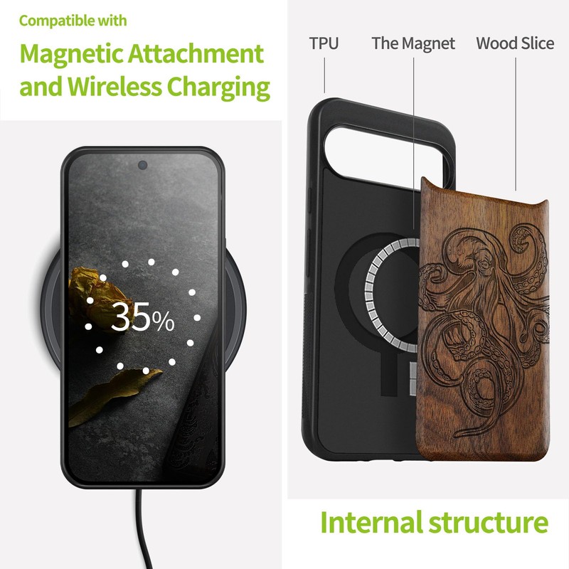 Carveit Magnetic Wooden Case for Pixel 9 Pro Google 9 Pro Case, Wood Artisan Engraved & Soft TPU Shockproof Cover, Compatible with MagSafe Wireless Chargers (Octopus Drawing) Walnut