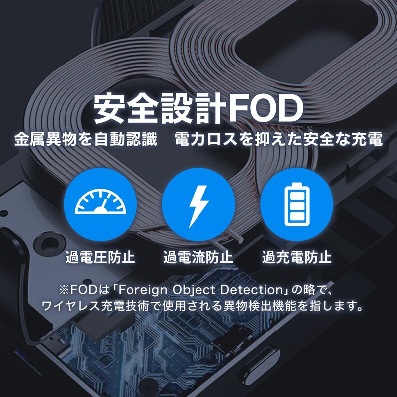 • Safe Design | FOD Checked: FOD checked (*) safety design prevents over-voltage, over-current, and over-charging. Supports automatic recognition of metal foreign objects and reduces power loss for safe charging. (*FOD stands for "Foreign Object Detection" and refers to foreign objects detection function used in wireless charging (wireless power) technology. )