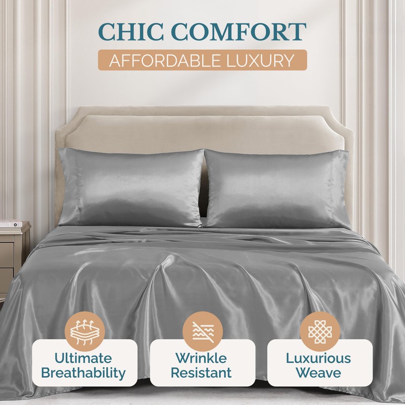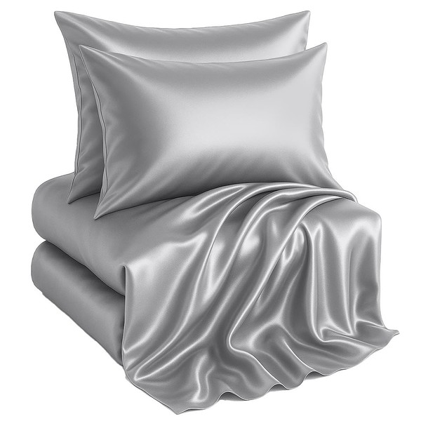 Casa Platino Satin Bed Sheets Set Full Size - 4 Pieces - Ultra Soft Like Silk - 1 Fitted Sheet, 1 Flat Sheet & 2 Standard Pillowcases - Breathable Satin Sheets, Suitable for Hot Sleepers - Light Gray