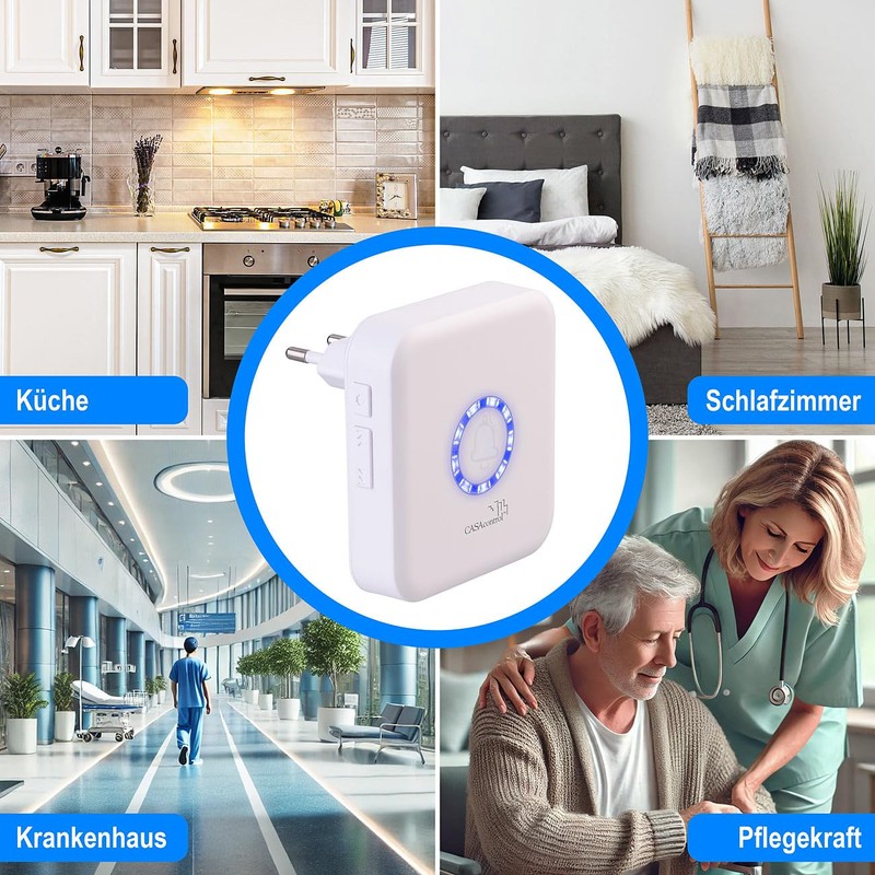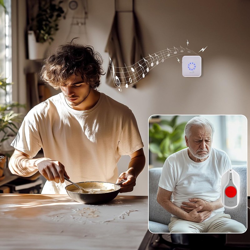 - Home emergency call for seniors - ideal for quick and easy alarming. 4 splash-proof transmitters with highly visible button for easy use. Up to 180 m range for safe reception even in large buildings. Adjustable volume up to 110 dB for loud and clear alarms. 64 different melodies to choose from for individual alarm adjustment. up to 6 additional Transmitter for more safety