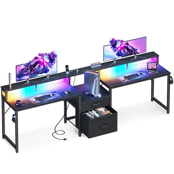 Casaottima 98" 2 Person Gaming Computer Desk with Fabric Drawer & File Cabinet, Two Person Long Writing Home Office Desk with Power Outlet & LED Light & Monitor Stand, Storage Shelves, Black