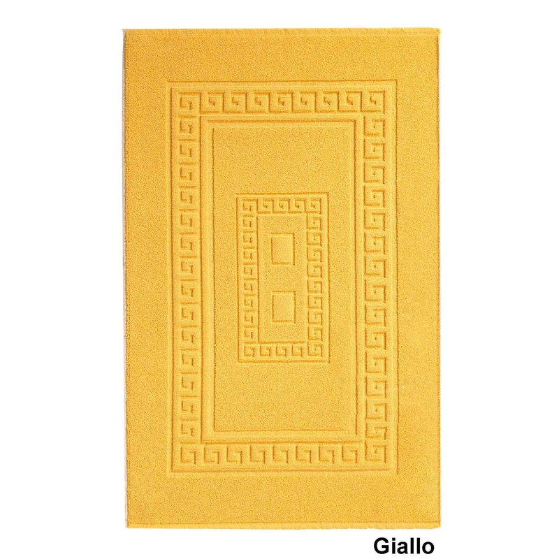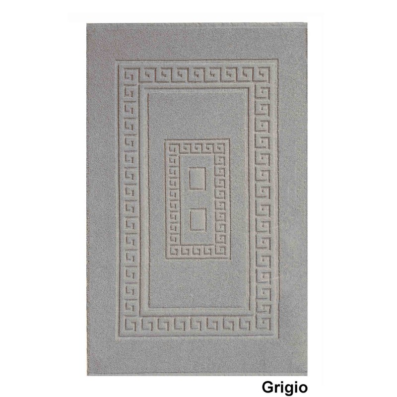 Torino, terry bathroom rug 60 x 90 cm. A large meander frames a central field, consisting of a smaller meander and two rectangles in the middle. A classic and everlasting pattern that you will never get tired of, consisting of cotton locks alternating with sheared fabric. A rug with terry cloth finish, practical, versatile, with high absorbency and good weight, washable in the washing machine and also reversible. Can be used from both sides without any problems. Available in many colours and sizes that you can find in the corresponding categories. Composition: 80 % cotton, 20 % polyester, weight: 1,200 g/m². Machine washable. Made in Italy