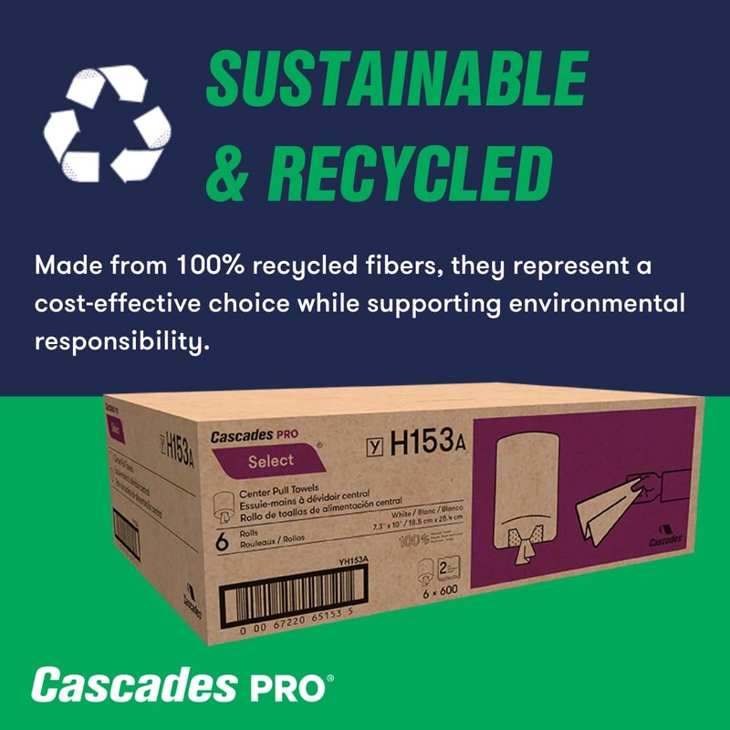 Cascades PRO Select H153 - Recycled Centerpull Hand Towel 2-Ply - Centerpull Paper Towel for Dispensers - Universal Fit - Premium Bulk - 6 Rolls / 600 Sheets - White