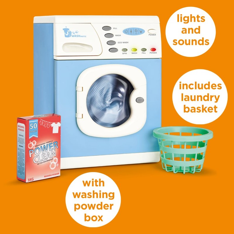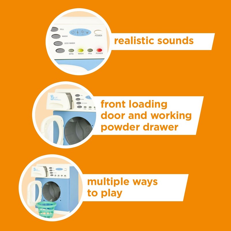 - INSPIRED BY REAL WASHERS: Empty the washing basket, load up the washer, put in the powder and choose a wash speed. Accompanied by lights and realistic sounds.