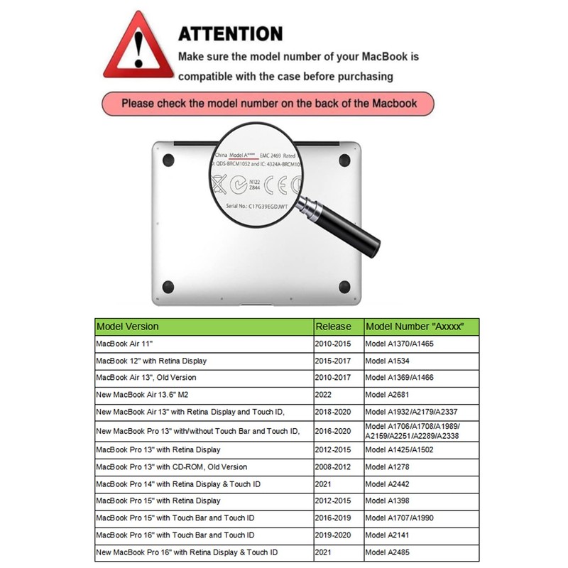 NOTE Please check the model number "AXXXX" on the bottom of your MacBook before purchase.