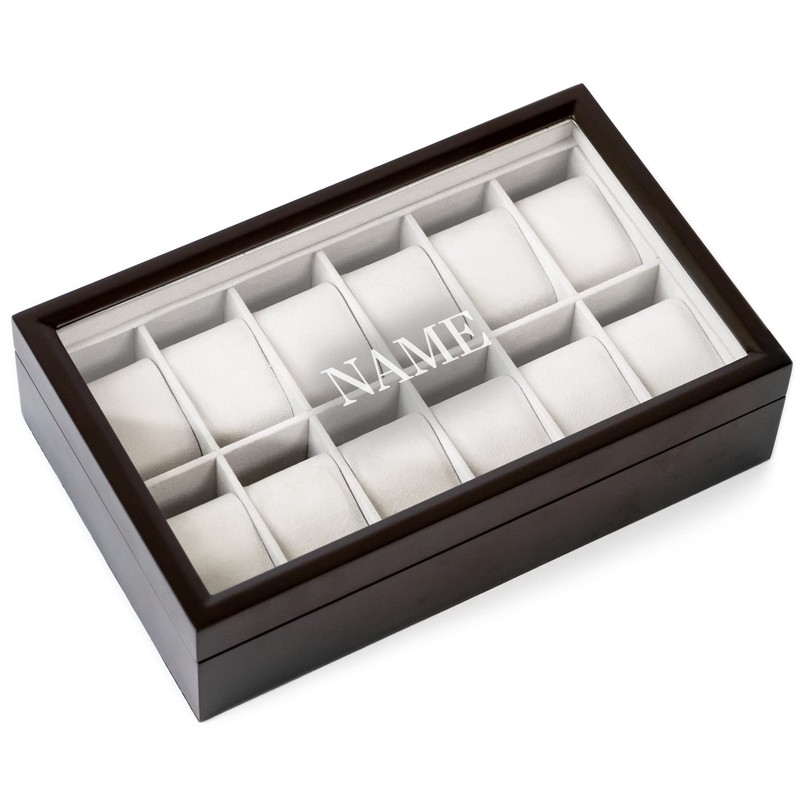 CASE ELEGANCE Monogrammed 12 Slot Espresso Wooden Watch Box Organizer with Glass Display Top