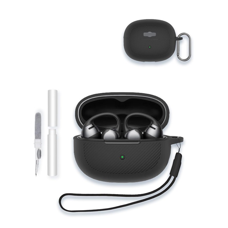 Case for SHOKZ OpenDots ONE - Open-Ear Headphones, WUNIAK Textured Anti-Slip Design Soft Silicone Protective Portable Scratch Shock Resistant Shell with Cleaner Kit & Carabiner & Lanyard ,Black