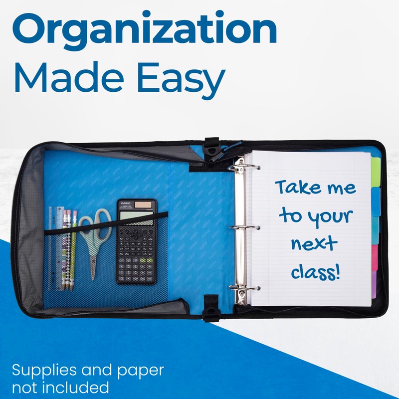 - THREE RING BINDER: 3-ring Zipper Binder with 2-inch O-ring (be sure to open rings with boosters at ends of spine to maintain proper ring alignment)