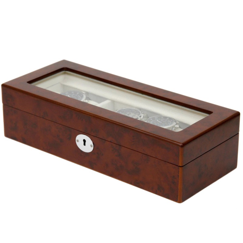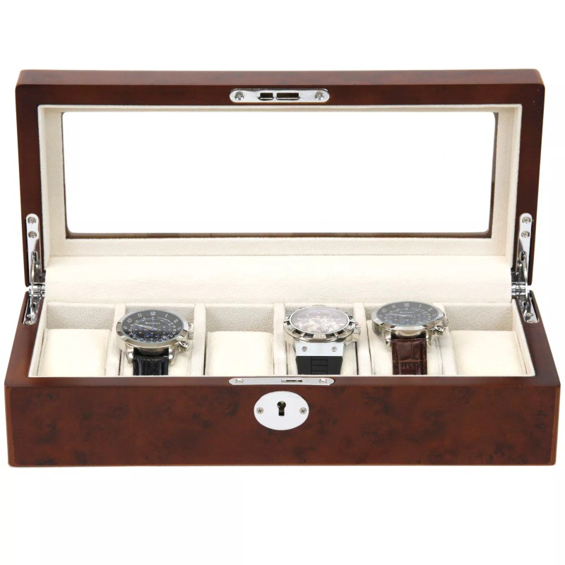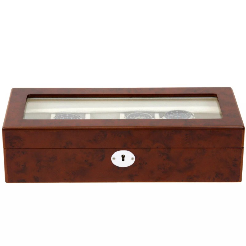 • Watch Box For 6 Timepieces Burlwood Finish with Glass Display Window