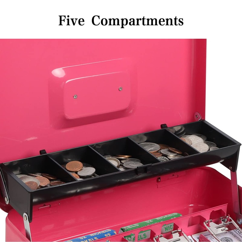 Cash Box with Money Tray and Key Lock, Parrency Large Money Box, 5 Compartments for Cions & 4 Spring-Loaded Clips for Bills, 11 4/5" x 9 2/5" x 3 1/2", Pink