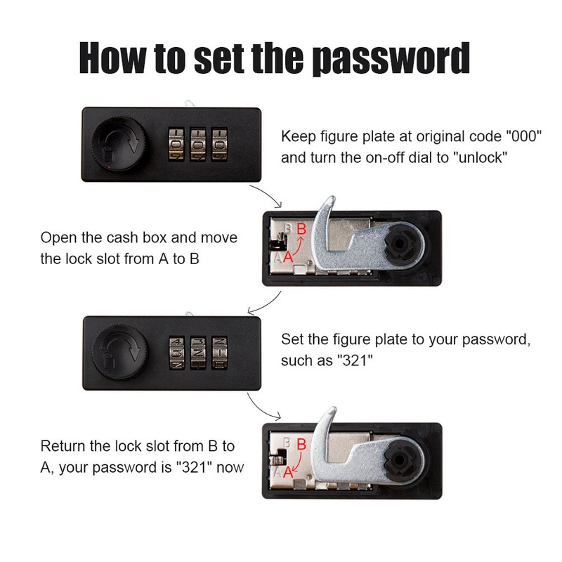 • Flexible Combination Lock: Money box is protected by 3-numbercombination lock. Which can be easily changed only by yourself
