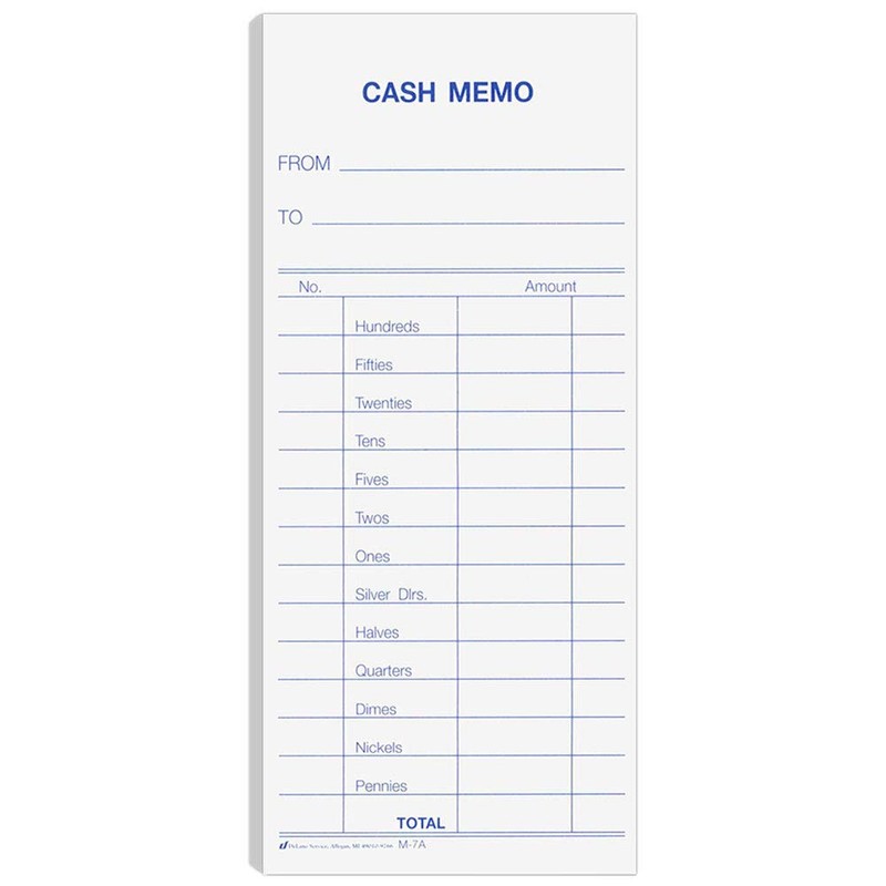A very simple yet detailed form when transferring cash between employees. This version is a single copy in padded form. Size: 2-3/4 in x 6-1/4 in. Printed in blue ink. Padded in 100's, 10 pads per pack