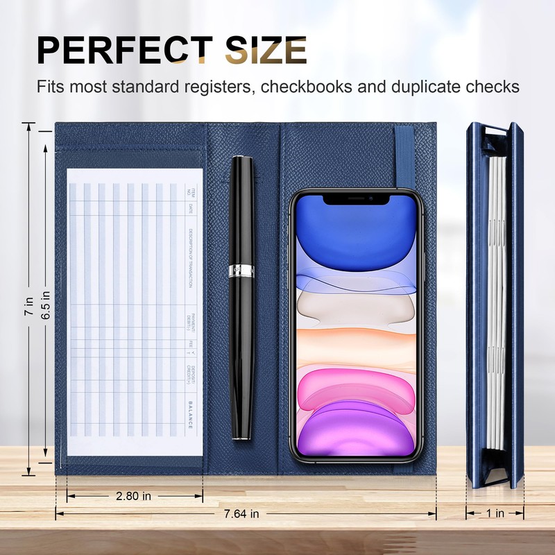 - Multifunctional Design: The left and right sides securely hold standard-sized top and side-tear checks. It features two compartments for your register, cash, or receipts, a central pen holder, and a clear PVC divider to protect the carbon copies of your checks while you fill them out.