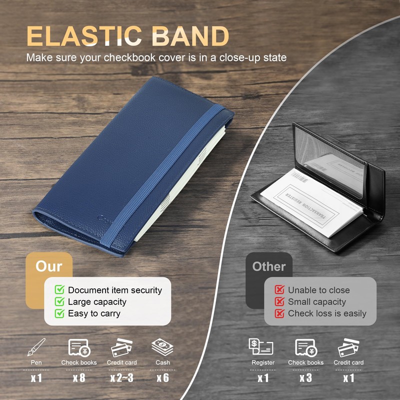 - Elastic Band: Tired of your checkbook not closing properly? This elastic band design effectively addresses that issue, ensuring the security of your checkbook, register, cash, and other important identification documents.