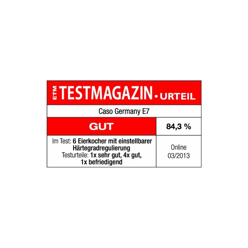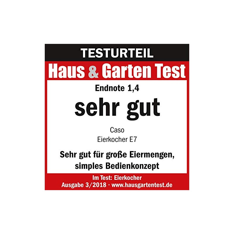 Der "E7" von CASO sorgt mit seiner innovativen 13stufigen elektronischen Kochstufenregelung für auf den Punkt gekochte Eier. Stellen Sie einfach an der Skala ein, ob Sie Ihre Eier weich, mittel oder hart wünschen, und Sie erreichen zuverlässig den gewünschten Härtegrad, ohne dass Sie die Wassermenge abmessen müssen. Das schicke Edelstahldesign mit Kunststoffglocke und herausnehmbarem Eihalter für 7 Eier ist auch optisch eine Zierde in Ihrer Küche. Inkl. Messbecher mit Eipiekser. Maße: 18 x 14 x 20,5 cm. <BR>350 W, 230 V.<BR><BR>