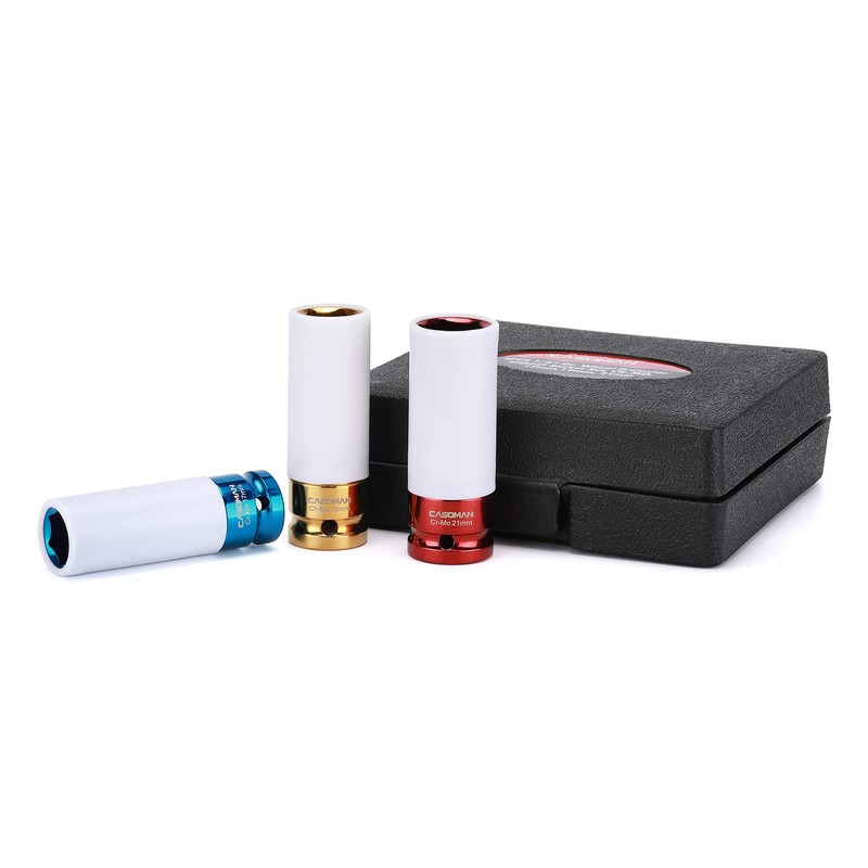 The CASOMAN 1/2 inch drive wheel protector impact socket is colour-coded, thin-walled, non-marring, and laser etched. 360° Non-scratch Nylon sleeve and insert protect bolt tops, wheel rims, and lug nuts from scratches during use. Heavy duty plastic blow-molded carrying case for easy transport, simple storage, and quick organization. Meets or exceeds DIN performance standards. It comes with 1 year quality warranty.
