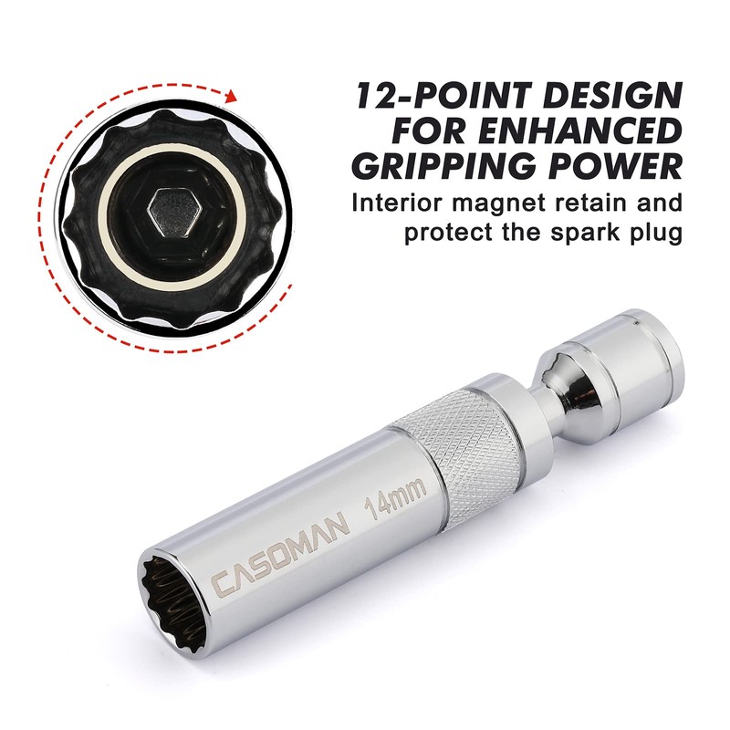 - The spark plug socket has 360 degree swivel action for maximum flexibility, 12-point design for enhanced gripping power.
