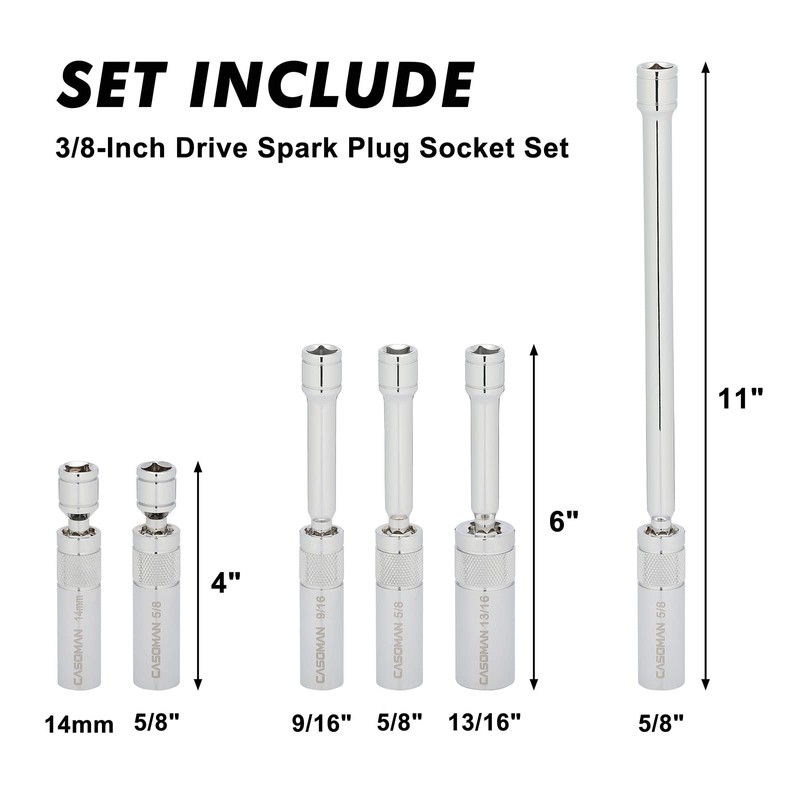 - 3/8-Inch Drive Magnetic Spark Plug Socket Set Include: 9/16-Inch, 5/8-Inch, 13/16-Inch, 14mm Socket, Total Length: 4 inch, 6 inch, and 11inch