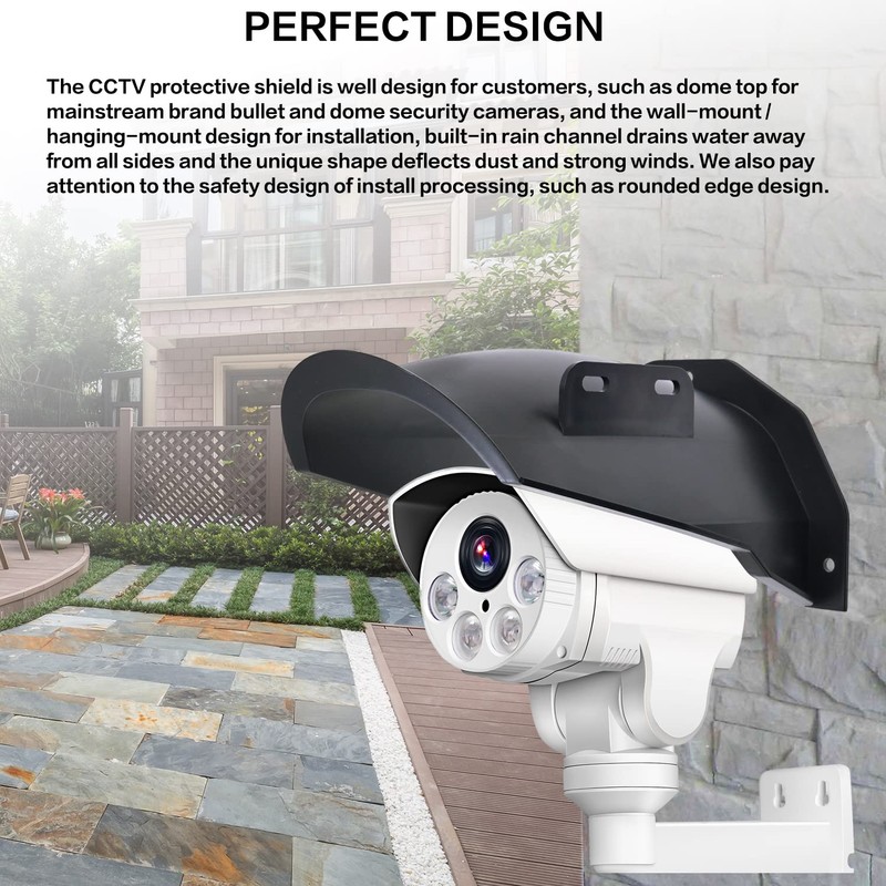 - PERFECT DESIGN - The CCTV protective shield is well design for customers, such as dome top for mainstream brand bullet and dome security cameras, and the wall-mount / hanging-mount design for installation, built-in rain channel drains water away from all sides and the unique shape deflects dust and strong winds. We also pay attention to the safety design of install processing, such as rounded edge design.