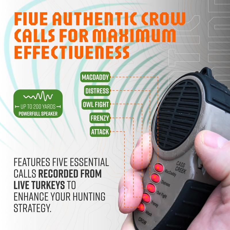 - AUTHENTIC CALLS – The 5 calls are the basic needs of hunting crows: MacDaddy, Crow Distress, Crow/Owl Fight, Crow Frenzy and Hawk Attack.