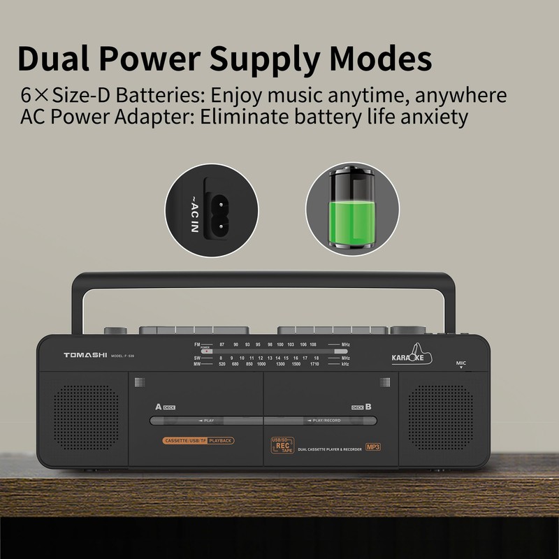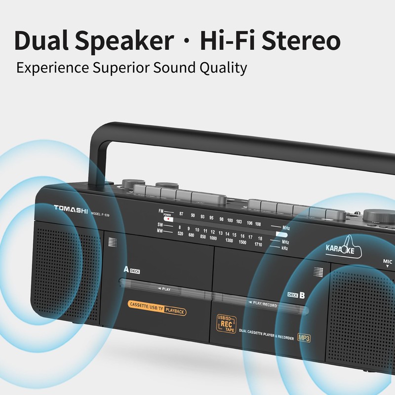 Cassette Tape Player with Stereo Sound, Dual Tape Decks, 3-Band Radio, USB/TF Card Playback, and Tape-to-USB/TF Card Recording Function